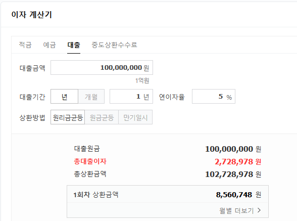 정확한 비교를 위해 대출금액 1억원, 대출기간 1년, 연 이자율 5%로 예를 들어 설명하도록 하겠습니다.