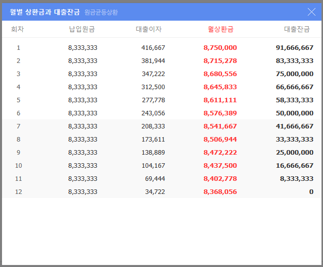 원금균등상환 방식으로는 동일한 원금 8,333,333원을 갚으며 총대출이자는 2,708,333원이다.