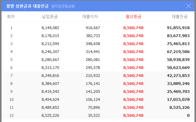 원리금균등상환 방식으로는 매월 8,560,748원의 원리금을 갚으면 됩니다.