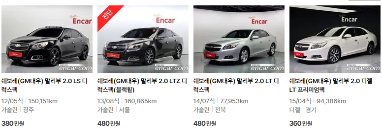 동시대에 출시된 YF 소나타와 K5에 비해 가격이 높았던데다가 감가가 가장 크게 형성되어, 현재 500만원으로 접근 가능한 차량으로 유명한 것이 바로 쉐보레 말리부 구형입니다. 원래 쉐보레가 현기차에 비해 감가를 많이 맞습니다. 이 차량은 당시 출시되면서 쉐슬람을 양산한 대표적인 차종 중 하나였습니다.